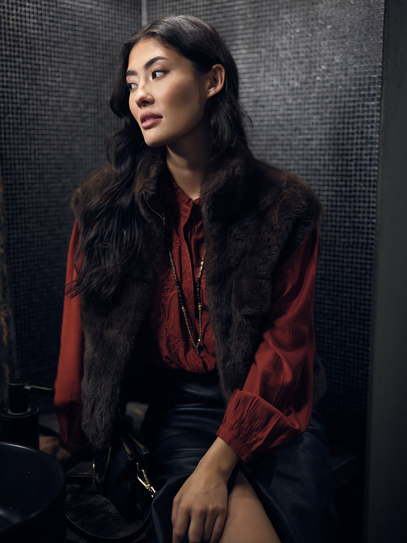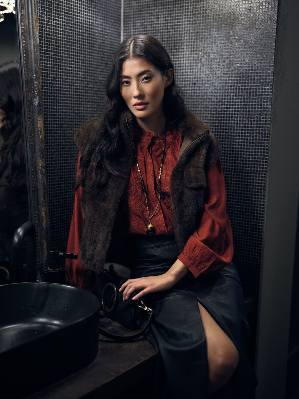 Dieser Look verbindet warme Materialien, klare Linien und die Trends der Saison: Die strukturierte Fake-Fur-Weste trifft auf eine satinierte Bluse in Tiefrot und einen Leder-Midirock mit Schlitz. Die Kombination ist modern, selbstbewusst und dennoch zurückhaltend – und kommt mit gewünschtem Bijou-Twist.