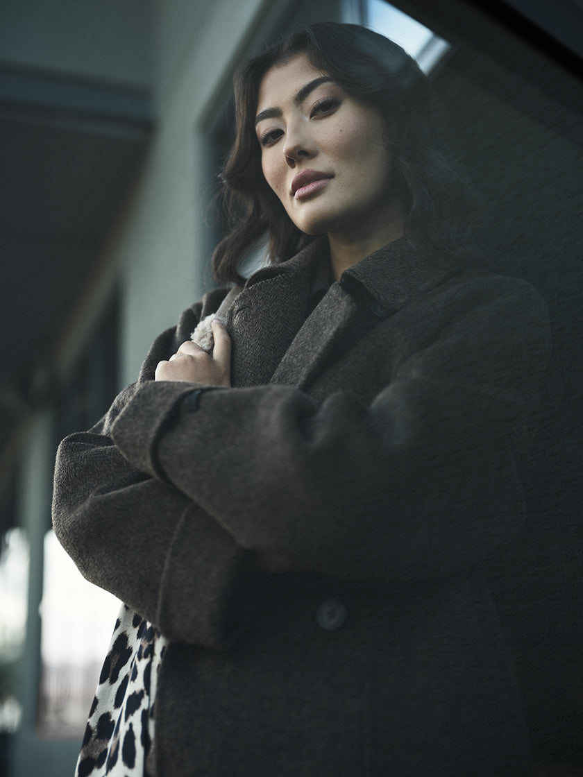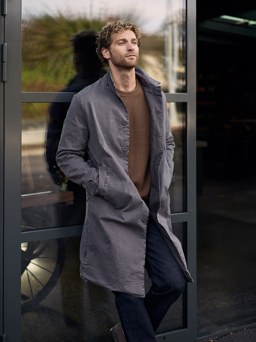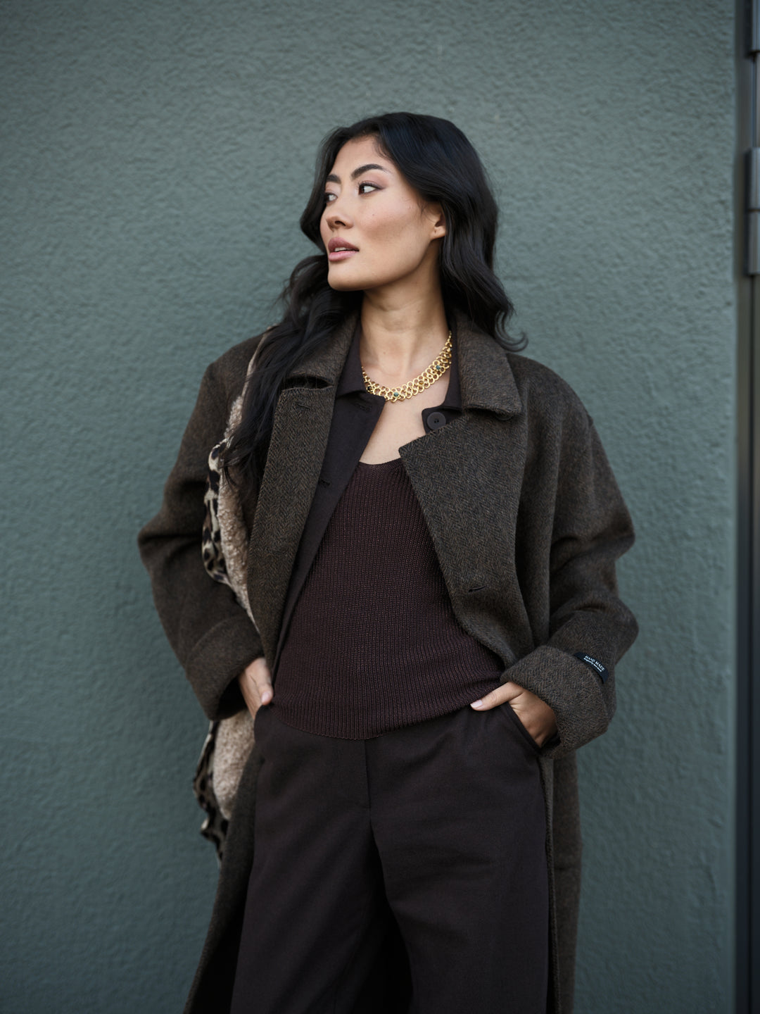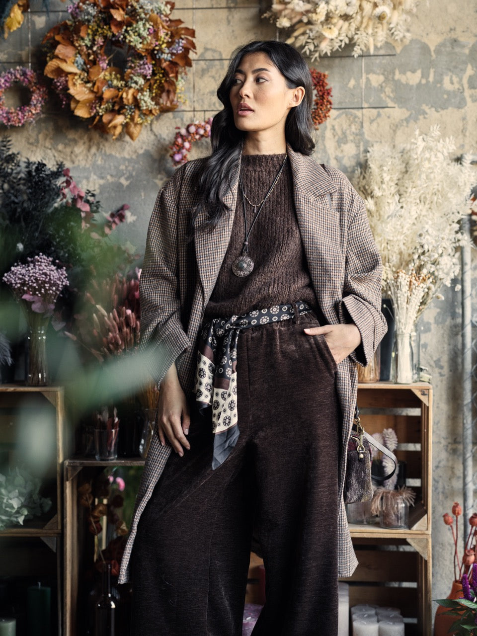 Ein monochromer Look, der zeigt, wie modern Festtagsmode sein kann: Dunkle Brauntöne, edler Strick und ein klassischer Mantel wirken in Kombination ruhig und elegant. Die weite Hose sorgt für Komfort, das Stricktop mit Lurex-Faden für den nötigen Glam.