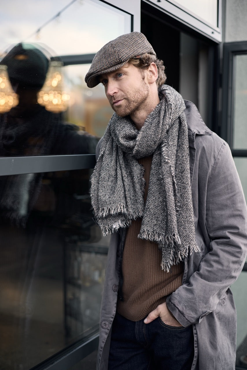 Dieser Look setzt auf Wärme und lässigen Stil: Schal, Strick und Mantel ergeben ein harmonisches Ganzes. Die Schiebermütze verleiht dem Outfit einen Hauch Retro-Charme – perfekt für einen Spaziergang über den Weihnachtsmarkt.