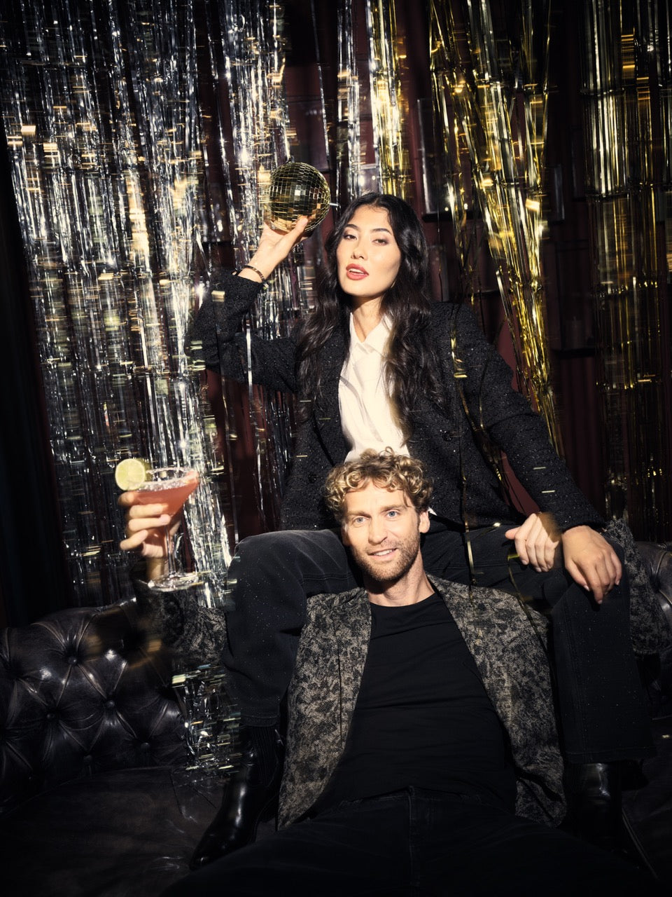 Für Silvester darf es etwas mehr sein: Die glitzernde Jeans vereint Lässigkeit und Eleganz, die Bluse mit abnehmbarer Krawatte setzt einen spannenden Akzent zwischen modern und klassisch. Dem Ganzen setzt der mit Pailetten besetzte Blazer die Krone auf.