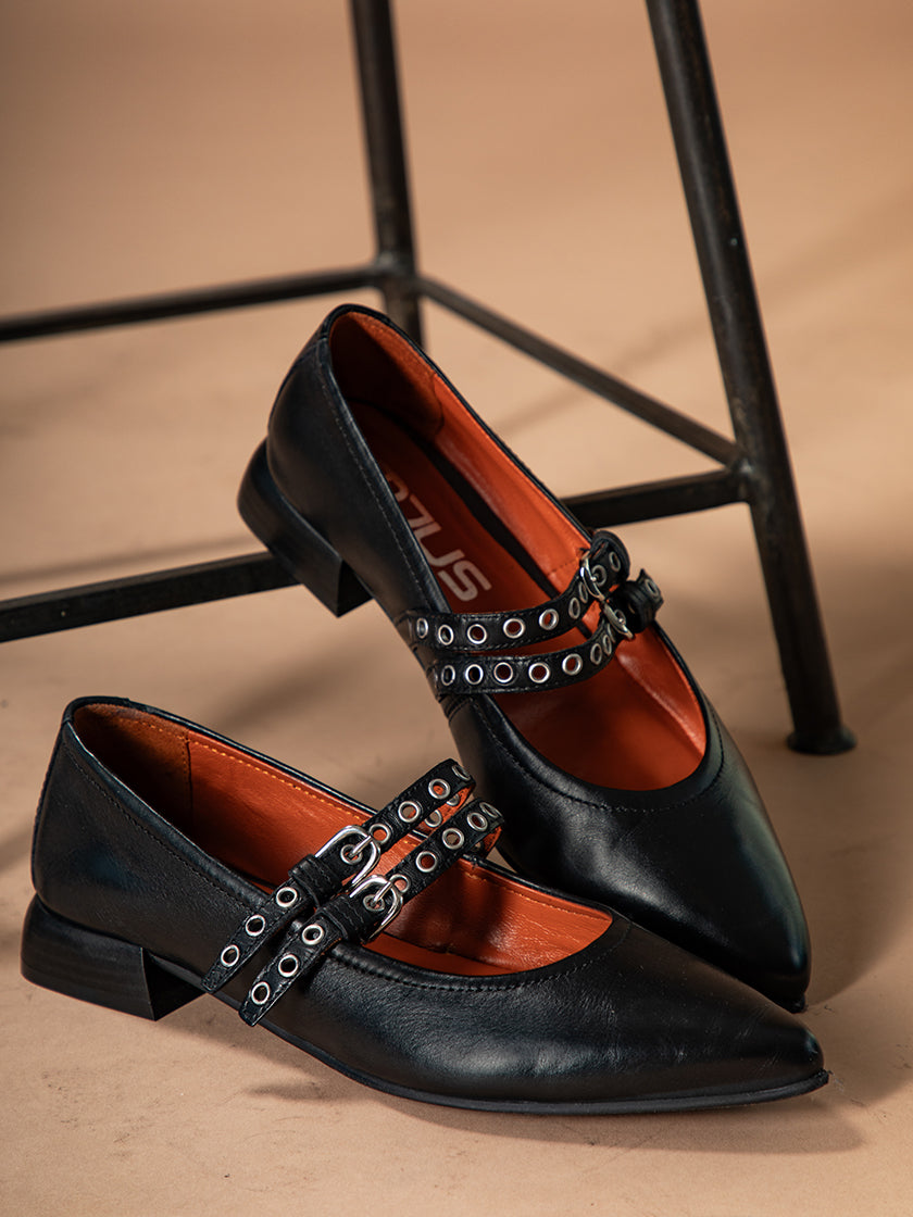 Dieser Ballerina von MJUS verbindet feminine Eleganz mit einem Hauch Rock-Chic. Die spitz zulaufende Form sorgt für eine schlanke Silhouette, während die dekorativen Riemchen mit Metall-Details dem Modell einen individuellen Charakter verleihen.