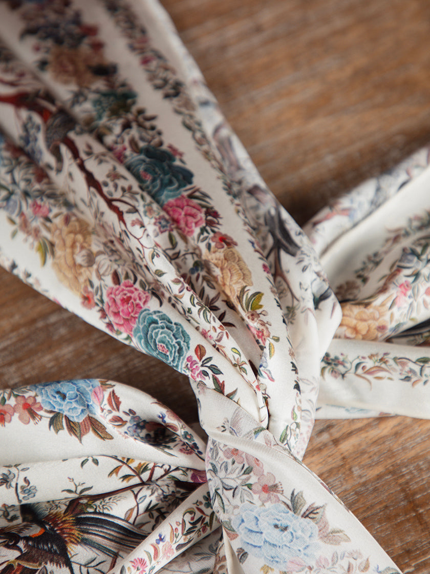 Dieser luxuriöse Seidenschal mit zartem Vogelmuster ist dein perfekter Begleiter für stilvolle Momente. Die geschmeidige Seide umhüllt dich sanft und verleiht deinem Look eine zeitlose Eleganz.