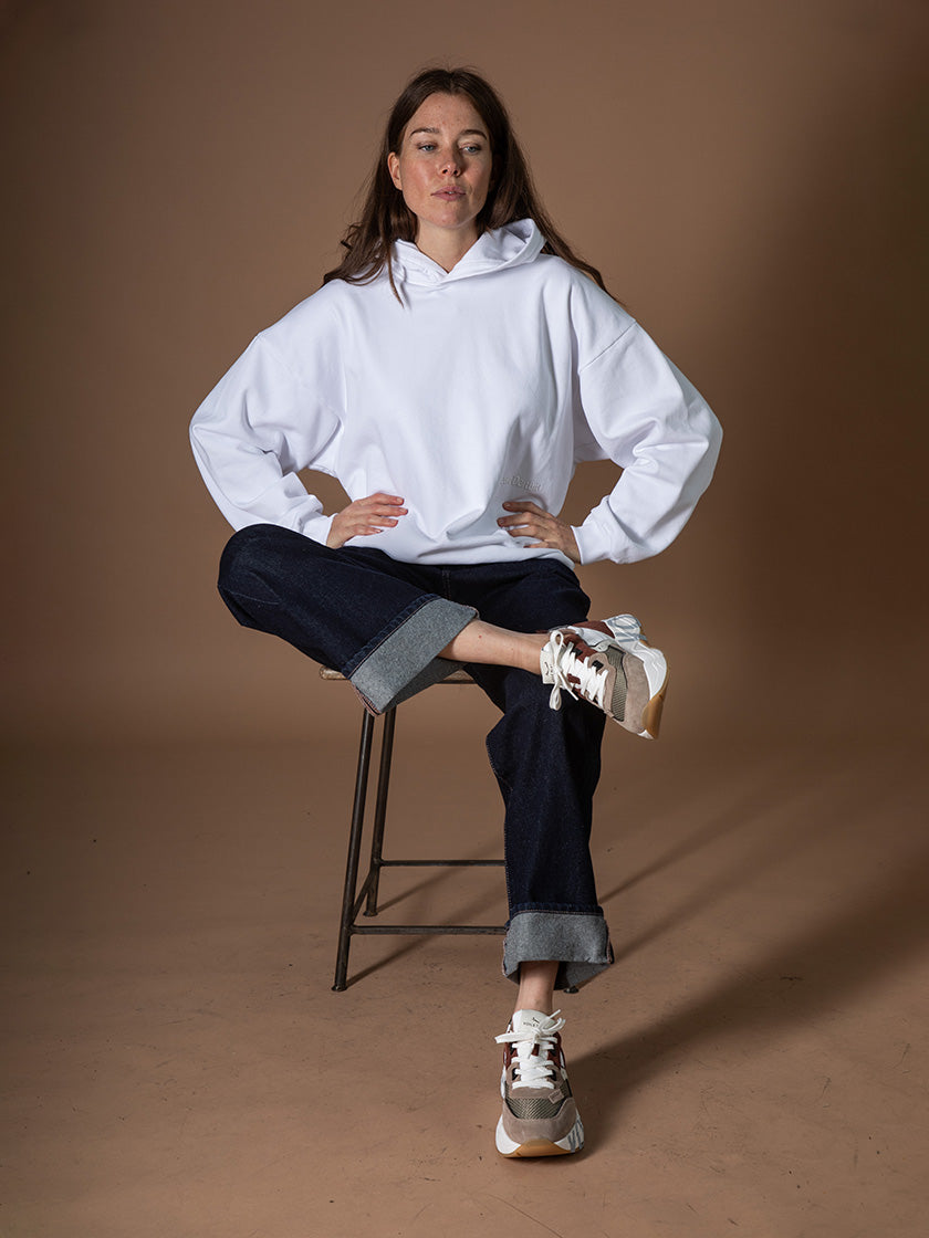 Ob in dezentem Weiss oder trendigem Altrosa – dieser Hoodie lässt sich vielseitig kombinieren und passt perfekt zu Jeans, Jogpants oder unter eine Jacke.