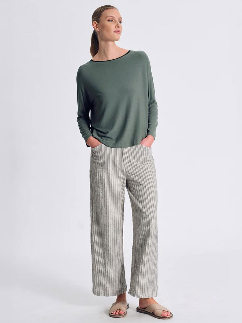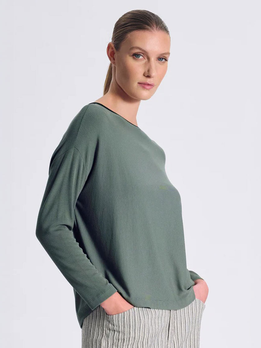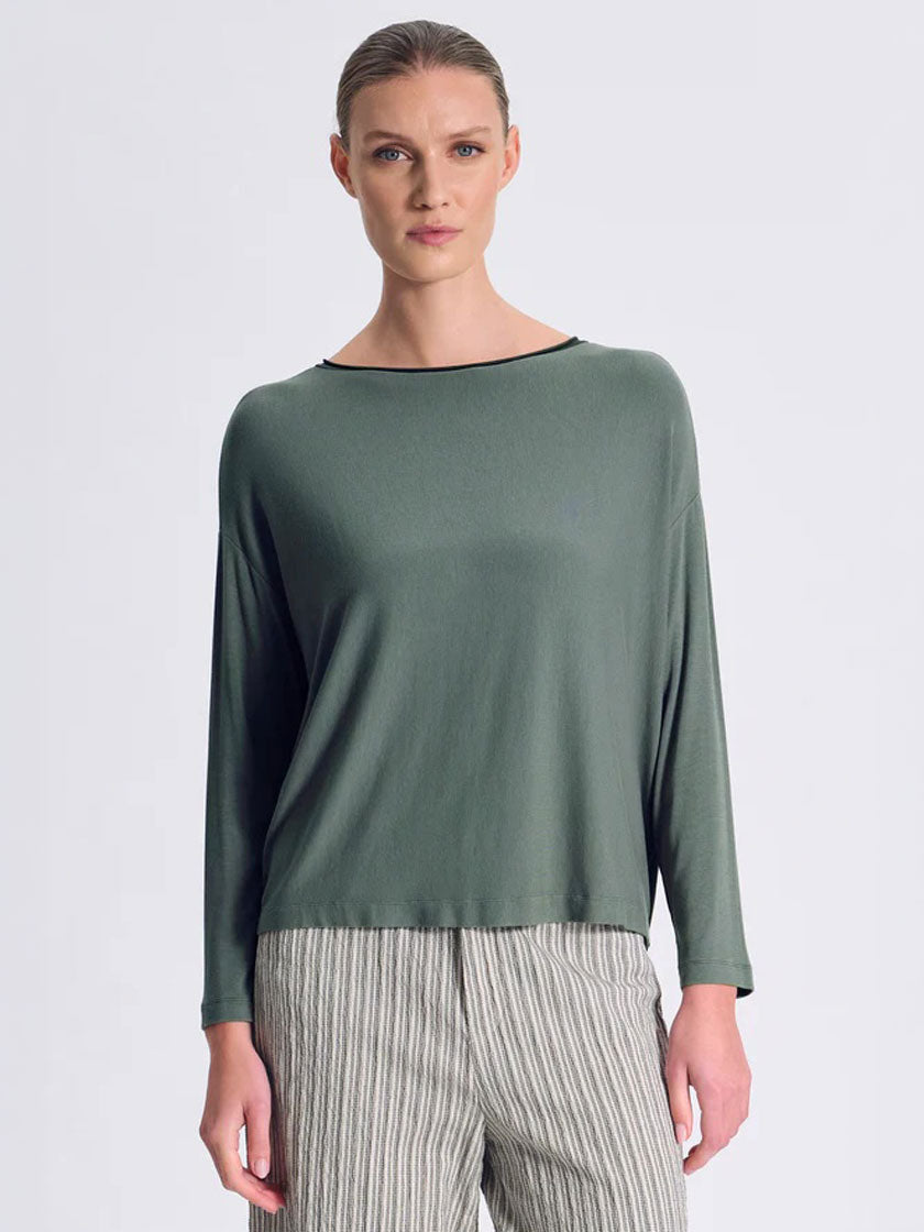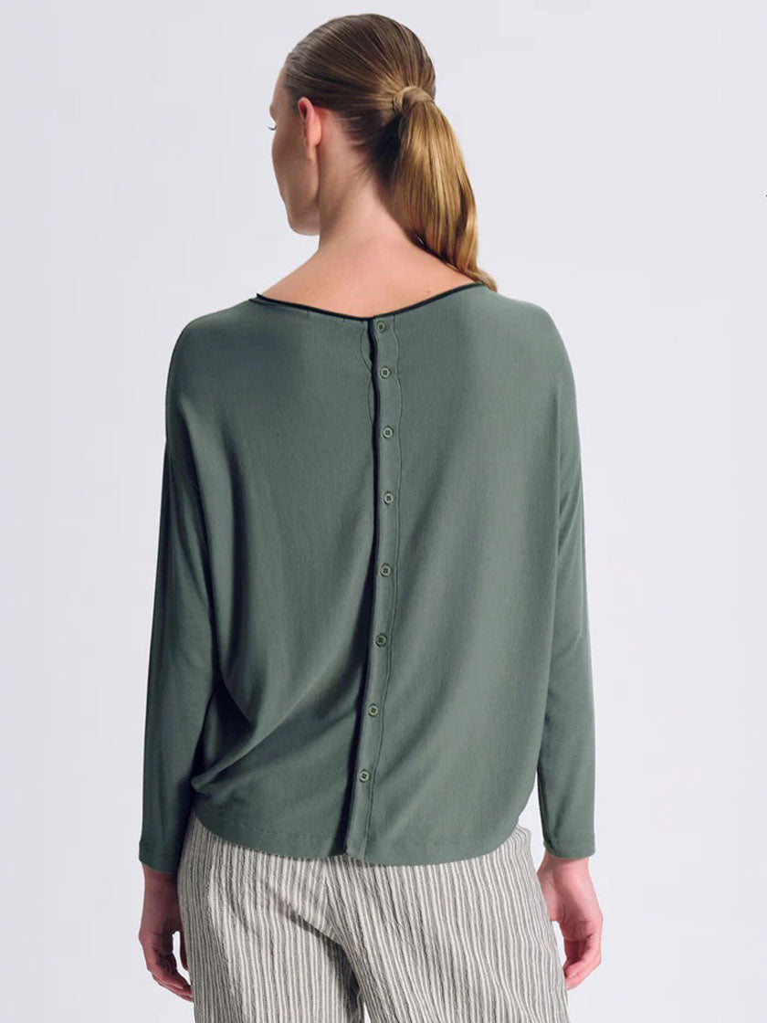 Gerippter Longsleeve aus weicher Modal Jersey Mischung mit markanter Oversize-Silhouette und überschnittenen Ärmeln. Der U-Boot-Ausschnitt besticht durch ein wellenförmiges Strickfinish, während der Körper horizontal und die Ärmel vertikal gerippt sind. Der Saum präsentiert sich im angesagten Rohschnitt-Look. Das Design zeichnet sich durch seine asymmetrische Länge aus – vorne kürzer, hinten länger – und schafft so ein subtiles Treppenelement auf Hüfthöhe. Die Rückseite wird von acht Knöpfen mit welligem Finish und Rohschnitt-Details akzentuiert. Ein Statement-Piece mit durchdachten Details für einen modernen, lässigen Look.