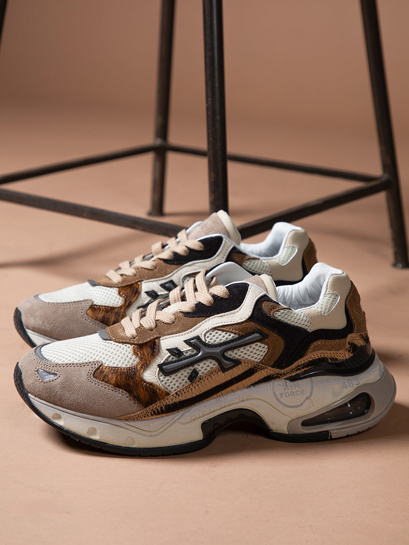 Der Sneaker «Sharkyd» von PREMIATA vereint markantes Design mit höchstem Tragekomfort. Die dynamische Silhouette, kombiniert mit einer auffälligen Farbgebungin Beige-Braun- und Schwarztönen, macht diesen Schuh zum echten Blickfang.
