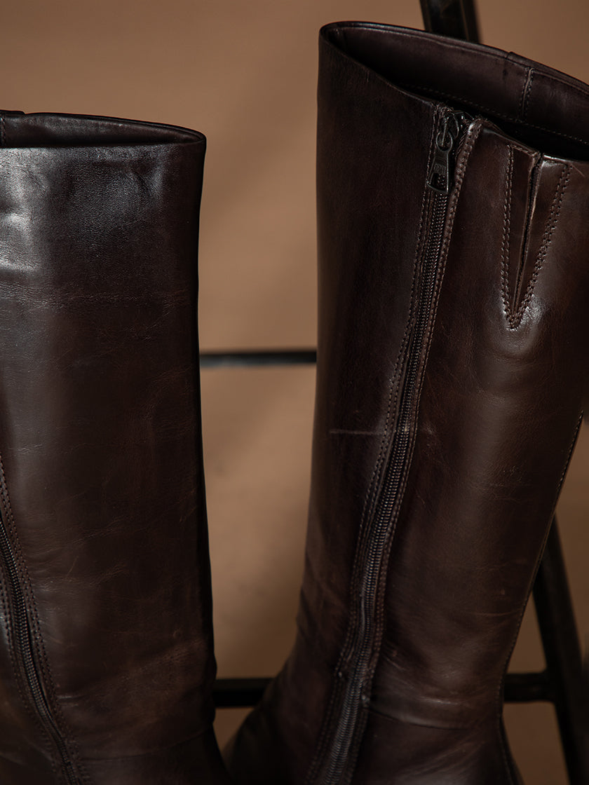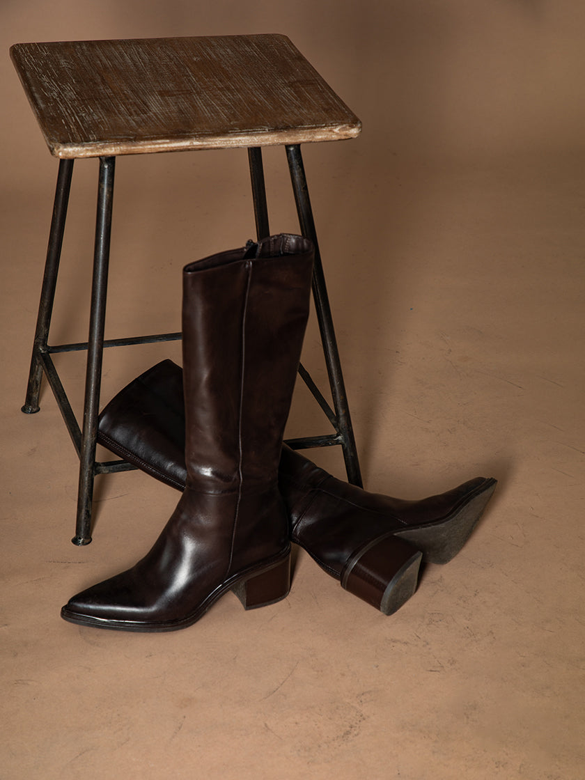 Dieser kniehohe Stiefel von MJUS überzeugt durch seine klare Silhouette, das edle dunkelbraune Leder und den femininen Schnitt. Ein zeitloses Design, das sich vielseitig kombinieren lässt – von urban bis elegant.