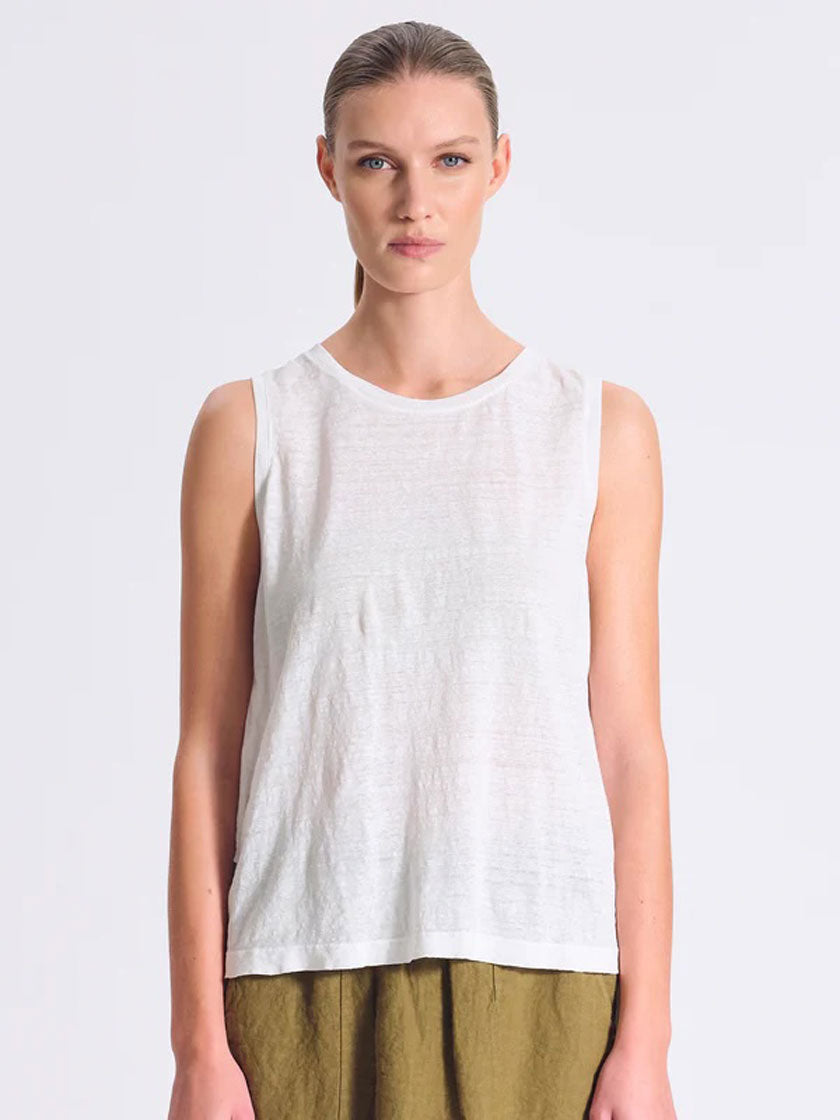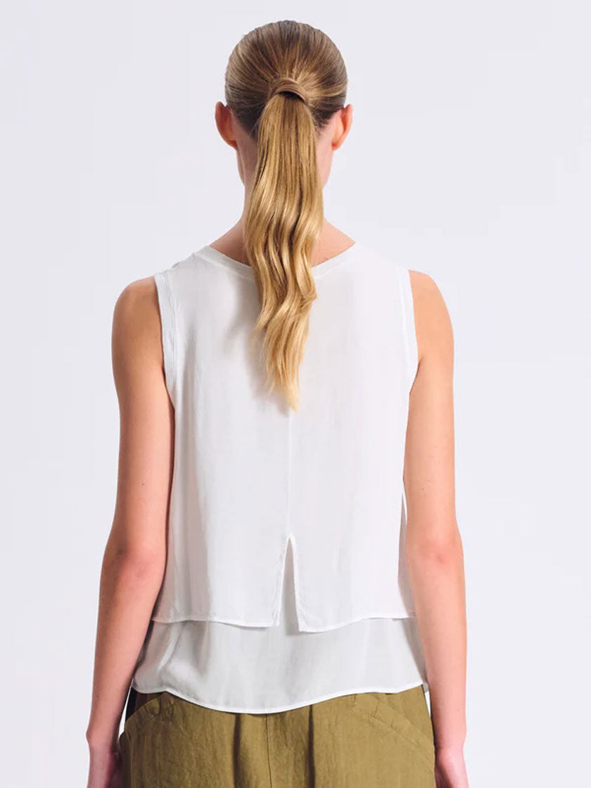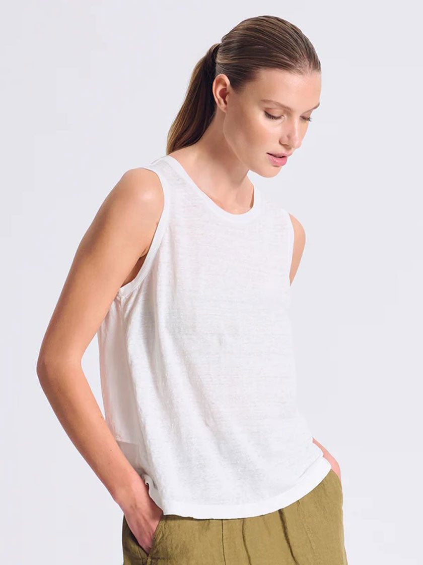 Dein neues Lieblingsstück: Ein Top mit klassischem Rundhalsausschnitt und breiten Trägern, die perfekt sitzen. Die Ärmel und der Kragen sind mit praktischen Rippbündchen versehen. Das Besondere liegt in der Materialkombi – vorne trägst du weiches Leinenjersey, während der Rücken aus zwei asymmetrischen Lagen fliessender Viskose-Georgette besteht. Die weite Passform gibt dir maximale Bewegungsfreiheit und Tragekomfort. Jedes Stück ist stückgefärbt, was ihm eine individuelle Note verleiht.