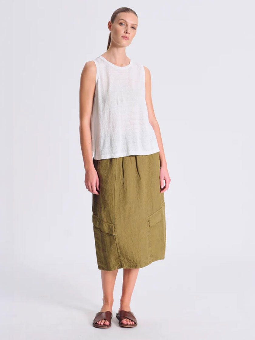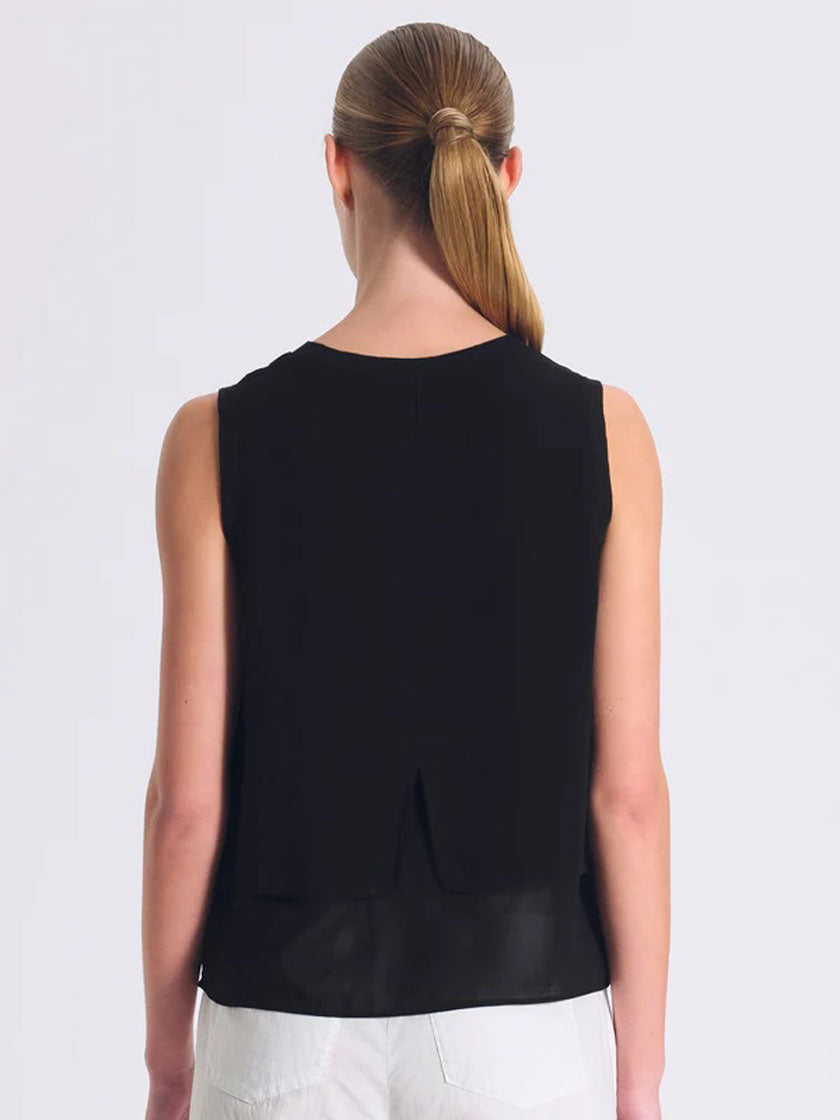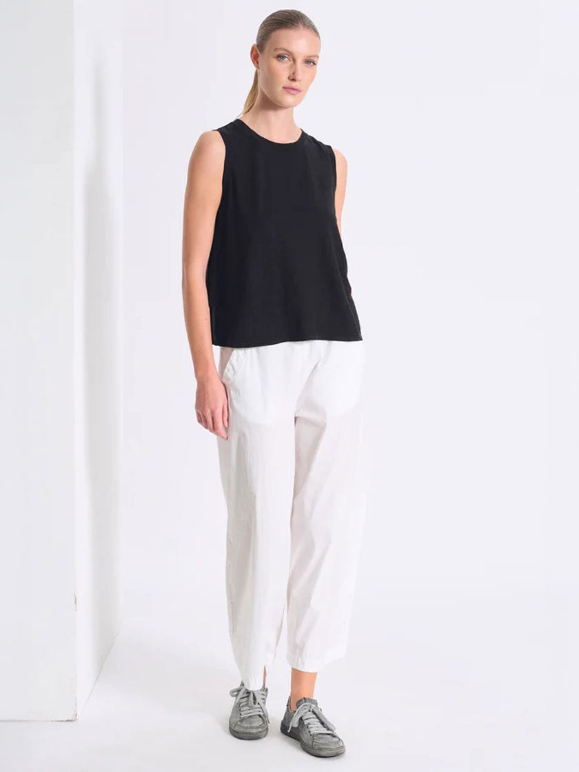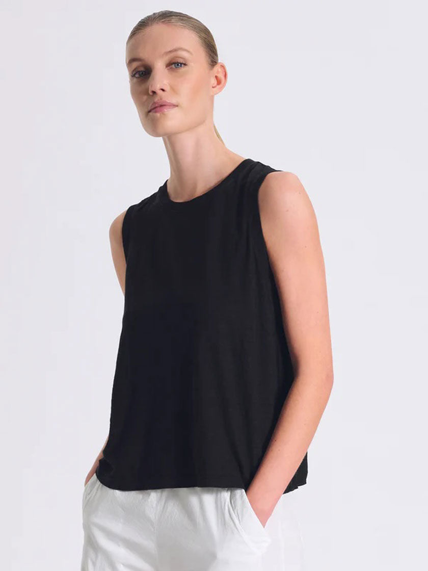 Dein neues Lieblingsstück: Ein Top mit klassischem Rundhalsausschnitt und breiten Trägern, die perfekt sitzen. Die Ärmel und der Kragen sind mit praktischen Rippbündchen versehen. Das Besondere liegt in der Materialkombi – vorne trägst du weiches Leinenjersey, während der Rücken aus zwei asymmetrischen Lagen fliessender Viskose-Georgette besteht. Die weite Passform gibt dir maximale Bewegungsfreiheit und Tragekomfort. Jedes Stück ist stückgefärbt, was ihm eine individuelle Note verleiht.